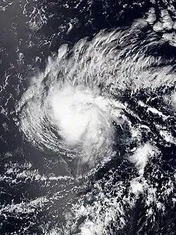On June 23, a broad area of low pressure formed off the coast of southern Mexico, in an area which the NHC had for several days been monitoring for potential tropical development.[30] The disturbance quickly became better organized on June 27, and advisories were initiated on Tropical Storm Adrian at 21:00 UTC that same day.[31] Adrian strengthened rapidly, and became the season's first hurricane at 15:00 UTC on June 28, while located about 360 mi (580 km) southwest of Manzanillo, Colima.[32] It then reached Category 2 hurricane status on June 30, with the hurricane maintaining a distinct eye surrounded by a ring of −70 °C (−95 °F) convection on satellite.[33] Adrian reached maximum sustained winds of 105 mph (165 km/h) that day,[34] before entering an environment of stronger wind shear and cool sea surface temperatures, causing it to weaken to a tropical storm the next day. Adrian weakened to a tropical depression early on July 2,[35] and degenerated into a remnant low later that day.[36]