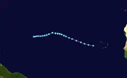 On June 23, a tropical wave exited the west coast of Africa and entered the Atlantic. After initially moving westward with little development for a few days, the wave began organizing on June 27. By 12:00 UTC on the following day, Tropical Depression Two formed about 1,380 mi (2,220 km) east of Barbados.[35] A strong subtropical ridge caused the depression to move generally west-northwestward through an unusually favorable environment for the time of year with warm sea surface temperatures (SST) and minimal wind shear, consequently beginning a period of rapid intensification.[62] The depression strengthened into Tropical Storm Beryl by 00:00 UTC June 29 and then into a hurricane about 24 hours thereafter. Beryl intensified into a Category 3 major hurricane around 12:00 UTC on June 30 and reached a peak intensity as a Category 4 hurricane with sustained winds of 130 mph (215 km/h) six hours later. Beryl then underwent an eyewall replacement cycle and briefly weakened to a Category 3 hurricane early on July 1, but regained Category 4 strength six hours later once the cycle was completed. At 15:10 UTC the same day, Beryl made landfall in Carriacou, Grenada, with winds of 140 mph (220 km/h). After entering the Caribbean, the hurricane further intensified into a Category 5 hurricane early on July 2 and soon peaked with winds of 165 mph (270 km/h) and a minimum pressure of 932 mbar (27.5 inHg), recorded by a dropsonde.[35]
