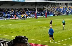 Oliver Leyland kicking at goal against the Wigan Warriors in March 2024