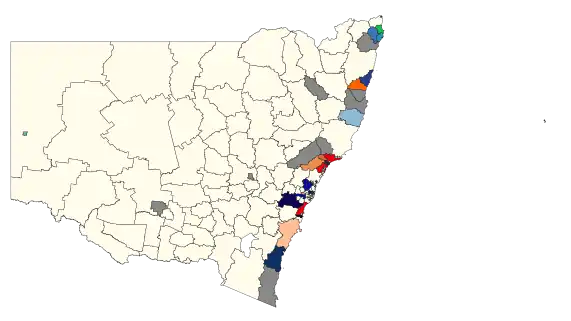 | LGA | Held by | Labor | Liberal | Greens | Independents[a] | Others |