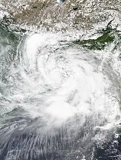 A low pressure area formed in the south Bay of Bengal on 20 October. On 21 October, it organised into a well-marked low pressure area. It strengthened into a depression on 22 October.[55] The same day in the evening, it had consolidated into a deep depression and moving in a west-northwest direction.[56] Over the next 6 hours, it intensified into cyclonic storm and was named Dana by the IMD.[b] On 23 October, it further intesified into a severe cyclonic storm.[58] The system made landfall between 23:30 IST of 24 October and 08:30 IST of 25 October close to Habalikhati Nature Camp (Bhitarkanika) and Dhamra Port on the Odisha Coast, weakening into a cyclonic storm.[59] It weakened into a deep depression at a distance of 40 km north-northwest of Bhadrak[60] and then into a depression about 70 km east-southeast of Keonjhar and remained stationary over that area, weakening further into a remnant low and dissipated on 26 October.[61]