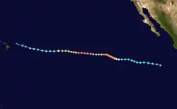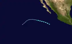 On August 18, the NHC began observation of a system well to the south of the coast of Mexico with potential for some slow development.[78] Four days later, on August 22, a broad area of low pressure producing disorganized showers and thunderstorms primarily west of its center formed far south of the southern tip of the Baja California peninsula.[79] By the afternoon of August 25, the tropical disturbance had developed a well-defined surface circulation with 45 mph (75 km/h) maximum sustained winds, and was upgraded to Tropical Storm Hector.[80] Northerly wind shear and passage over cool SSTs, left in the wake of Hurricane Gilma, prevented Hector from strengthening much.[81] Hector strengthened slightly on August 26 and reached its peak intensity, with maximum sustained winds of 60 mph (95 km/h) and minimum central pressure of 998 mbar (29.5 inHg).[82] Continued unfavorable environmental conditions caused Hector to gradually become less organized thereafter, with moderate wind shear exposing Hector's low-level circulation center.[83][84] Hector continued to weaken, and the storm opened into a trough early on August 29.[85]