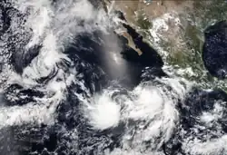 On August 3, the NHC began monitoring a tropical disturbance well to the south of the Baja California peninsula, and to the west of another developing disturbance.[36] The following day, the system quickly developed into Tropical Depression Five‑E.[37] The newly-formed cyclone strengthened into Tropical Storm Emilia early on August 5.[38] The disturbance east of Emilia developed into Tropical Storm Fabio the same day, and the cyclones began to interact with one another.[39] Emilia steadily strengthened as it became the dominant storm in its interaction with Fabio. After initially moving southward, the storm gradually turned back to the west then northward around Fabio.[40][41] Emilia reached its peak intensity early on August 7 with maximum sustained winds of 70 mph (115 km/h) and a minimum central pressure of 988 mbar (29.2 inHg). [42] Later that day, Emilia absorbed the remnants of Fabio as it accelerated northward.[43] Heading over cooler waters, Emilia began to quickly weaken. The storm produced little organized convection the following day, as it crossed the 75 °F (24 °C) isotherm towards even colder SSTs.[44] The storm degenerated into a post-tropical remnant low by 03:00 UTC on August 9, about 980 mi (1580 km) west of the southern tip of the Baja California peninsula.[45]