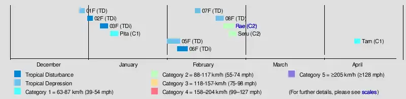 The season began abnormally late, the first system of the season, Tropical Depression 01F formed in late December. The storm eventually made landfall in Fiji and dissipated during the last few days of the year. Tropical Disturbances 02F and 03F were designated on 31 December and 5 January respectively, both stayed out to sea moving southeastwards before both dissipating 3 days later.