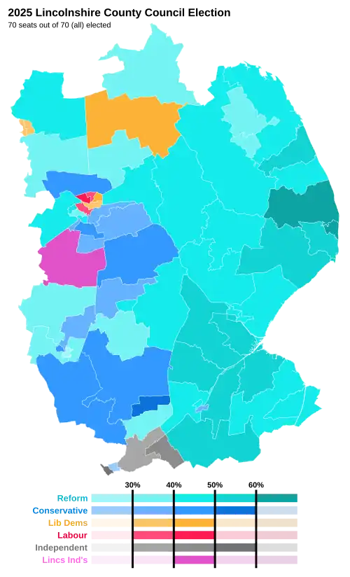 The 2025 Lincolnshire County Council election was held on 1 May 2025 to elect members to Lincolnshire County Council in Lincolnshire, England.[6] All 70 seats were up for election. This was on the same day as other local elections including the inaugural 2025 Greater Lincolnshire mayoral election. The council was under Conservative majority control prior to the election. Reform UK won a majority of the seats on the council at the election.