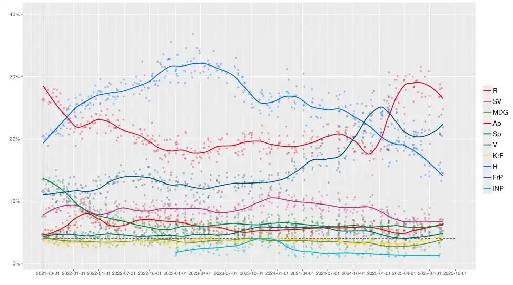 56. ^ "pollofpolls.no - Gjennomsnitt av nasjonale målinger med spørsmål om stortingsvalg august 2025". www.pollofpolls.no. Retrieved 16 August 2025.