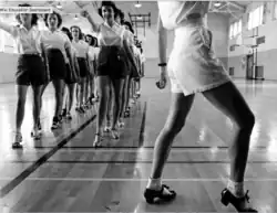 Following WWII, some women returned to a life of domesticity, while others desired to continue working. Women became increasingly involved in sports and it wasn't long after the war that the first women's athletic revolution, which allowed more rights for women athletes and coaches, was created.[2] For women not interested in joining sports teams, magazines continued to offer several articles full of advice for women on how to stay fit, including simple exercises, or popular fitness programs to join in on. Some articles capitalized on women's new-found independence, offering workout programs that would make them strong enough to help do "men's work" or hard labor in times of emergency, others offered after-hour fitness programs for working women, and some targeted the at-home mom and how she could fit fitness into her everyday routine without spending a penny.[15] During the late 40s special "exercise suits" that resembled swimwear of the time, even began to be offered for the everyday woman's fitness routines.[16]