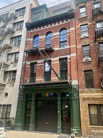 The building was originally constructed as a fire house used by Engine 16 of the New York City Fire Department.[1] Metropolitan Steam Fire Engine Company No. 16 had been established at the site in 1865, taking over the fire house formerly occupied by Engine Company No. 7.[2] On August 1, 1882, Napoleon LeBrun & Sons filed plans for a new three-story fire house on the site to serve as a replacement to the existing fire house.[1] The design of the building was nearly the same as another fire house designed by Napoleon LeBrun & Sons at 209 Elizabeth Street and similar to other fire houses that the firm designed at 269 Henry Street and 304 West 47th Street.[1][3][4][5] The land lot has a frontage of 25 feet (7.6 m) and a depth of 98 feet (30 m).[6] Construction of the fire house commenced in November 1882 and was completed in April 1883.[1] In 1906, the building was renovated with the addition of new reinforced concrete floors and iron staircases by the Schaefer-Carroll Construction Company.[7][8]