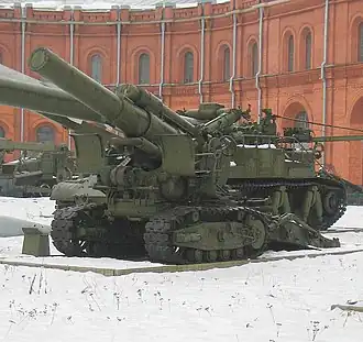 The Br-5 mortar was a 279.4 mm (11 in) calibre towed mortar with a barrel 14.2 calibres long. The Br-5 mortar shared the same tracked, box trail carriage as the 152 mm gun M1935 (Br-2) and the 203 mm howitzer M1931 (B-4). The carriage allowed transportation of the weapon over short distances with the speed of 5–8 km/h (3–5 mph), for longer distances the barrel was removed from the carriage and transported separately on a special wheeled cart, the Br-10, a speed of 25 km/h (16 mph) was possible with the barrel removed.[1][2]