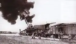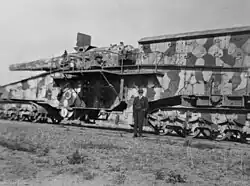 The E. u. B. could fire from any suitable section of track after curved wedges were bolted to the track behind each wheel to absorb any residual recoil after the gun cradle recoiled backwards. It also had a pintle built into the underside of the front of the mount. Two large rollers were fitted to the underside of the mount at the rear. Seven cars could carry a portable metal firing platform (Bettungslafette) that had a central pivot mount and an outer rail. It was assembled with the aid of a derrick or crane, which took between three and five days, and railroad tracks were laid slightly past the firing platform to accommodate the front bogies of the gun. The gun was moved over the firing platform and then lowered into position after the central section of rail was removed. After the gun's pintle was bolted to the firing platform's pivot mount, the entire carriage was jacked up so that the trucks and their sections of rail could be removed. The carriage was then lowered so that the rear rollers rested on the outer track. Concrete versions were also used. It could have up to 360° of traverse.[4]