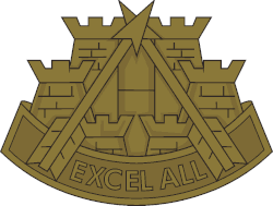 Distinctive Unit Insignia is a bronze device measuring 15/16 inch in height features a castle with six towers, with a scroll and the motto "EXCEL ALL." Two arrows, cross at their heads to form a star. The distinctive unit insignia was originally approved for the 2d Support Brigade on 6 June 1966.