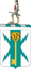 • Symbolism: Teal blue and silver refer to the colors formerly used for the U.S. Army Security Agency. The key symbolizes the unit's mission which is providing security. The golden bear's head on the key represents California where the unit activated. The lightning flashes, symbolizing electricity, relate to the importance of electronic communications as part of the unit's functions.