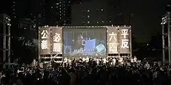 The main stage of 30th anniversary memorial of Tiananmen Square protests in Victoria Park, Hong Kong. The banner says "Redress June Fourth Incident. Justice will prevail."
