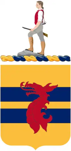 The regimental distinctive trimming was approved on 1 April 1924 and its coat of arms was approved on 30 March 1932. The distinctive trimming was a vertical representation of the original Flag of Chicago, where the unit was based. The coat of arms consisted of a yellow shield with two blue bars in the center. A red dragon was superimposed over the bars. The shield's color represented the Cavalry, the bars were from the Flag of Chicago, and the dragon symbolized great bravery and mobility, traits that a Cavalry unit was supposed to exemplify. The coat of arms included the Organized Reserve's Minuteman crest above the shield. The regimental motto was "Fide Et Animis" (By Faith and Courage).[5]