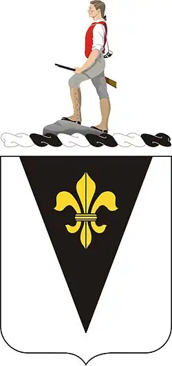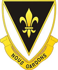 • Symbolism: White is the old Infantry color; the black pile is the background of the shoulder sleeve insignia of the 83d Division and the gold fleur-de-lis indicates the organization’s service in France. The motto translates to "We Guard."