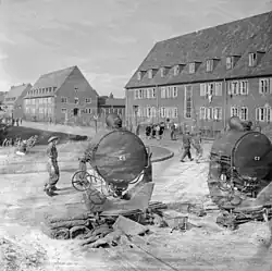 On 1 October, 344 Bty came under the command of 100 AA Bde in XXX Corps, and was deployed to defend the vital bridges at Nijmegen. These bridges were under regular attack from the air and from frogmen with explosive charges, so searchlights had to sweep the river as well as the sky.[22][27] The battery (less B Troop, which was providing movement light for various formations' night moves and bridging operations) remained at Nijmegen until 11 November, when it handed over its commitments to 356 S/L Bty of 74 AA Bde, and moved up with 100 AA Bde to rejoin XII Corps. It provided movement light for operations by 51st (Highland) Division towards Weert and Roermond (14–21 November), during which it was sometimes subjected to shelling and bombing. At the end of November it moved from Weert to Helden, where it resumed an AA role, and then in December went into Corps reserve at Nederweert for rest and maintenance.[22]