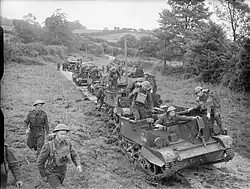 After Dunkirk, the battalion left the 23rd Division on 29 June 1940.[6] It was under command of Home Forces until November 1940 when it joined the 3rd Infantry Division, a Regular Army formation,[8] as a motorcycle battalion. The battalion was one of only two Territorial Army units in the division, the other being 76th (Highland) Field Regiment, Royal Artillery. On 30 April 1941 it was transferred to the Reconnaissance Corps and redesignated as 3rd Battalion, Reconnaissance Corps; then on 6 June 1942 as 3rd Regiment, Reconnaissance Corps (NF); and finally on 1 January 1944 it was transferred to the Royal Armoured Corps as 3rd Reconnaissance Regiment (NF).[9] It remained part of the 3rd Infantry Division until August 1945.[10]