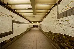 The NYCTA started constructing a 300-foot-long (91 m) passageway between the two stations in 1969. Workers dug a trench measuring 20 feet (6.1 m) wide and 35 feet (11 m) deep, then covered the trench with a 14-foot-deep (4.3 m) layer of fill. The project involved removing 14 plane trees from Bryant Park, which prompted protests from preservationists.[84] The developer of the nearby 1095 Avenue of the Americas office building contributed $500,000 to the station's renovation in exchange for permission to build additional office space.[85] About half of the tunnel was decorated with terrazzo floors; orange brick and tile walls; glass and steel railings; and recessed lighting.[86] The NYCTA completed the tunnel in 1971, upon which it was used by an average of 6,500 passengers during weekdays. The tunnel was decorated with eight porcelain murals, each measuring 10 feet (3.0 m) wide. The murals depicted historical and present-day structures at Bryant Park, including the Latting Observatory and New York Crystal Palace.[87]