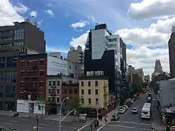 Most of the buildings in the area are of late 19th or 20th-century construction, such as the two adjoining 459 to its west, and the commercial building across the street. There are, however, some other 21st-century buildings by notable architects in the neighborhood. On the immediate east is the 2009 Chelsea Modern by Audrey Matlock. Frank Gehry's 2007 IAC Building is located a block to the west at the 11th Avenue intersection, with Jean Nouvel's 100 Eleventh Avenue just to its north on the corner with 19th Street. Between it and 459 the High Line elevated linear park crosses 18th Street.[8]