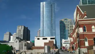 505, previously known as 505 CST and Paramount, is a residential skyscraper in downtown Nashville, Tennessee, located at the intersection of Fifth Avenue and Church Street. 505 stands on the location originally intended for the cancelled Signature Tower.[3] The 45-story building is 543 feet (166 m) tall[2] and feature 403,000 sq ft (37,400 m2) of floor space.[4] 505 is the tallest building in Nashville based on occupied floors,[6] and the third tallest overall behind the AT&T Building and the Four Seasons Hotel and Residences.[3] It includes 500 apartment units ranging from under 400 sq ft (37 m2) to more than 4,000 sq ft (370 m2),[6] with an option to later convert the top 175 units to condominiums.[4] Other planned areas include three retail spaces including an 8,000 sq ft (740 m2) ground-level restaurant,[6] a 45,000 sq ft (4,200 m2) amenity level,[4] and 690 parking spaces.[3] It is expected to cost US$169 million.[7] The architect is Solomon Cordwell Buenz.[3]