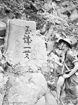 A soldier from the 57th/60th Battalion examines a Japanese obelisk in New Guinea, April 1944
