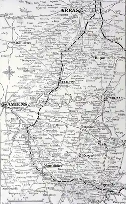 The remnants of the 66th Division were holding a position south of the Somme, with the 50th Division to the right and troops from the Third Army over the river to the left. An attack on the morning of 26 March, opening the Battle of Rosières, pushed back the units on the north bank and the 66th Division retired, losing contact with the 50th Division, which fell back on Rosières-en-Santerre to avoid being flanked. "Little's Composite Battalion" with the remaining troops of the 198th Brigade, moved from reserve to Foucaucourt and defended the village until the early afternoon, retired to Framercourt and then filled a 3,000-yard (2,700 m) gap between the 66th and 39th divisions.[34][35] The battalion had been formed from stragglers and reinforcement drafts by Lieutenant-Colonel W. B. Little, commander of 1/5th Borders, who had been on leave when the German offensive began and moved up towards the front line during 25 March.[36] Other British troops were north of the 66th Division around Vauvilliers and by that night, the line south of the Somme was held by 16th, 39th, 66th and 50th divisions.[37] The battle continued on 27 March, with the 66th Division pushed back to Harbonniers.[38] That night, the division took up positions between Wiencourt and Guillaucourt, facing north on a line of about 1 mile (1.6 km).[39] The three brigade headquarters had moved forward to reinforce the front line; until the 66th Division was reorganised later in the year, casualties were so numerous that the brigade structure was not reformed and the brigadiers took turns to command the infantry.[40] On the morning of 28 March, a German attack broke through at Guillaucourt and the 66th Division retreated south to Cayeux-en-Santerre, with the 39th Division on the left. By nightfall, the line had been pushed back to Ignaucourt, a few miles from Amiens.[41]