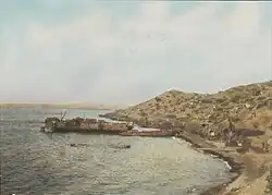 By now the decision had been made to abandon the Suvla sector, and on 15 December the battalion embarked for Mudros, the rearguard of two officers and 45 other ranks arriving on 24 December. On 27 December 7th Gloucesters sailed once more for Helles, landing on V Beach on 27 December, the left half of the battalion relieving 1/4th Bn East Lancashire Regiment at Fusilier Bluff and the right half taking over the support line. The last Turkish attacks at Helles were repulsed on 7 January 1916, when the commanding officer of 7th North Staffords was killed and Major Harry Bull of 7th Gloucesters had to take over temporary command of both battalions. On the night of 8/9 January Helles was also evacuated, with 7th Gloucesters sailing from W Beach aboard the troopship HMS Ermine back to Mudros.[7][9][20]