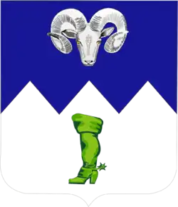 • Shield- Per fess dancetté Azure and Argent, in chief a ram's head affronté of the second and in base a jack boot Vert.