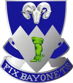 A Silver color metal and enamel device 1 3/16 inches (3.02 cm) in height overall consisting of a shield blazoned: Per fess dancetté Azure and Argent, in chief a ram's head affronté of the second and in base a jack boot Vert. Attached below and to the sides of the shield a Blue scroll turned Silver inscribed "FIX BAYONETS" in Silver letters.