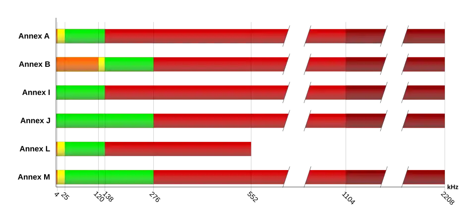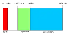 Frequency plan for ADSL Annex A, with frequency-division multiplexing.[3] Red area is the frequency range used by normal voice telephony (PSTN), the green (upstream) and blue (downstream) areas are used for ADSL.
