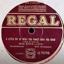 It became one of the best known music hall songs of its era.[1] The music hall historian Richard Anthony Baker described it as "a summary of Marie Lloyd's music hall philosophy".[2] Lloyd recorded the song for the Regal label in 1916. She knowingly presented the song with a sexual innuendo, with lyrics such as: "I always hold in having it if you fancy it / If you fancy it that’s understood / And suppose it makes you fat? I don’t worry over that / ‘Cos a little of what you fancy does you good."[3]