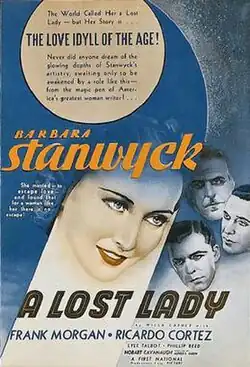 A Lost Lady is a 1934 American drama film directed by Alfred E. Green and starring Barbara Stanwyck, Frank Morgan and Ricardo Cortez. It is based on the 1923 novel A Lost Lady by Willa Cather, with a screenplay by Gene Markey and Kathryn Scola. Warner Bros. had produced a 1924 silent film based on the story, starring Irene Rich.
