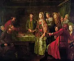 A Sorcerer Comes to a Peasant Wedding is a painting by the Russian artist Vassily Maximov (1844–1911), completed in 1875. It belongs to the State Tretyakov Gallery (inventory number 585). The size of the canvas is 116×188 cm[1] (according to other data - 117.7×189.8 cm).[2][3] The painting depicts an episode of a peasant wedding feast, the joyful course of which is disturbed by the sudden appearance of a snow-covered village sorcerer.[4][5]