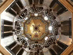 The upper gallery openings are divided by a grid of columns. These columns are ancient and come from St. Gereon in Cologne. Charlemagne allowed further spolia to be brought to Aachen from Rome and Ravenna at the end of the 8th century. In 1794, during the French occupation of the Rheinland, they were removed to Paris, but in 1815 up to half the pieces remaining in the Louvre were brought back to Aachen. In the 1840s they were restored to their original places once more and new columns of Odenberg granite were substituted for the missing columns. The interior walls were initially lined with a marble facade.[4] The round arched openings in the upper floor in the side walls of the octagon, between the columns, in front of a mezzanine, are decorated with a metre-high railing of Carolingian bronze rails. These bronze rails were cast 1200 years ago in a single piece according to Roman models. The original cupola mosaic was probably executed around 800 and known from Medieval sources depicted Christ as the triumphant lord of the world, surrounded by the symbols of the Four Evangelists, with the twenty-four elders from the Apocalypse of John offering their crowns to him. In 1880–81 it was recreated by the Venetian workshop of Antonio Salviati, according to the plans of the Belgian architect Jean-Baptiste de Béthune. The dome was intricately decorated with a mosaic tile.[4]