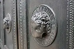 The bronze leaves attached to this porch, the Wolfstür (Wolf's Door), weigh 43 hundredweight altogether (cf. with this the Lousberg saga). The main entrance to the cathedral, the door was cast in Aachen around 800 and was located between the westwork and the octagon in the so-called hexadecagon up to 1788. The portal was restored in 1924.[15] Each leaf is divided into eight rectangles – a number which had religious symbolism in Christianity, as a symbol of Sunday, the day of the Resurrection of Jesus Christ and also of perfection (as did twelve, also) and can be found in the measurements of the Palatine Chapel over and over again. These boxes were framed by decorative strips, which are made of egg-shaped decorations. The egg was considered a symbol of life and fertility from antiquity. In Christian belief it was imbued with the even wider symbolism of Eternal Life. The door-rings in the shape of lions' heads are wreathed by 24 (i.e. two times twelve or three times eight) acanthus scrolls – again to be understood at the deepest level through numerology. The Wolfstür's imitation of the shape of the ancient Roman temple door signifies Charlemagne's claim, to have established a New Rome in Aachen with the Palatine Chapel as the distinctive monumental building.[16]