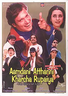 Aamdani Atthanni Kharcha Rupaiya (lit.'Income is 50 paise and expenses are a whole rupee'; cont. Expenses are greater than wages) sometimes abbreviated as AAKR is a 2001 Indian Hindi-language comedy film directed by K. Raghavendra Rao starring Govinda, Juhi Chawla, Tabu and Johnny Lever. This was the remake of the Tamil film Viralukketha Veekkam, directed by V. Sekhar. The film was an above average grosser at box office.[1][2][3]