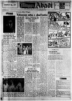 The newspaper began publication on 2 January 1951, initially led by Suardi Tasrif and printed in Jakarta. It was founded as the party newspaper of Masyumi, with a motto of "for religion, nation and country".[1][2] Being a politically affiliated newspaper, Abadi would often become hostile to the sitting government when Masyumi was in the opposition - in 1953, for example, the distribution of Abadi in prisons was banned.[3] During the mid-1950s, Abadi had a daily circulation of around 34,000, behind the Indonesian National Party's Suluh Indonesia, the Indonesian Communist Party's Harian Rakjat, and the Socialist Party of Indonesia's Pedoman.[4] Although owned by an Islamic party, Abadi generally did not censor publications or advertisements deemed "morally inappropriate" such as scantily clad women in soap advertisements or the results of government lotteries.[5] It was distributed nationally, with agents in various cities in Java, Sumatra and Bali.[2]