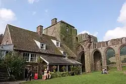 The Abbey Hotel is located next to the ruins of Llanthony Priory and actually incorporates the south-west tower of the monastic building. The remainder of the building may have originally been the lodgings for the prior.[1] The surrounding Augustinian priory originated around 1100, and the presently existing church, chapter house and cloisters were built between 1180 and 1220. After being dissolved in 1538, the priory fell into disrepair.[2] The building that is now the hotel was remodelled in the early 19th century, probably by the poet Walter Savage Landor, who bought the abbey in 1803 and lived on the site for a short period.[1] The four-storey south-west tower of the priory was a direct adaptation of the original 13th-century structure.[1]
