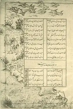 Another of `Abd al-Hayy's pupils, Ahmad Jalayir created similar monochromatic, black and white drawings to accompany his manuscripts in the Abusa'idnama ('Book of Abu Sa'id').[1] While texts from the time period do not directly confirm `Abd al-Hayy's involvement nor influence over these manuscripts, many scholars have concluded with firm certainty that these illustrations were done by `Abd al-Hayy. Evidence for this can be seen in the text of the manuscript that states that the unnamed painter, who was assisted by Aḥmad b. Ovays, prepared an Abū Saʿīd-nāma containing black and white drawings, a signature of `Abd al-Hayy.[2] There are also a number of paintings that explicitly state that they were copied from `Abd al-Hayy's drawings, some of which can be dated back to the late 14th century.[2]