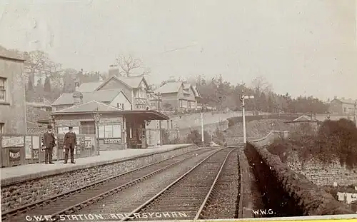 The station was opened as "Abersychan" by the Monmouthshire Railway and Canal Company on 2 October 1854.[2][3] It was renamed "Abersychan Low Level" on 14 May 1885;[2][3] this came not long after the opening of Abersychan and Talywain by the London and North Western Railway on its joint line with the Monmouthshire Railway between Pontnewynydd Junction and Varteg Colliery which opened in 1879.[4] By this time the Monmouthshire was for most practical purposes part of the Great Western Railway, which had worked it from August 1875 and eventually took it over with effect from 1 August 1880.[5][6]