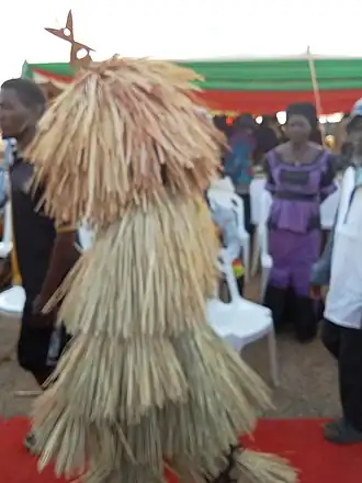 The Agwam Abwoi (chief priest) afterwards sips some of the beer from the a̠sum (small pot) and asks for a good agricultural year or season from the ancestors. Older initiated men usually went into the shrine, while the younger boys and women stayed beneath a shade such as a large tree, while the ceremony commence. As at when dancing begins, the loud resonating voices of the Abwoi is heard from the concealed roof of the shrine disguised by the use of a two-ended large gourd, covered with spider's egg capsule.[4]