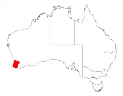 It is native to an area in the South West region of Western Australia where it is found on hills and ridges growing in gravelly sandy soils often containing laterite.[2] The plant along the Darling Range from around Marradong in the north to Nannup in the south.[1]