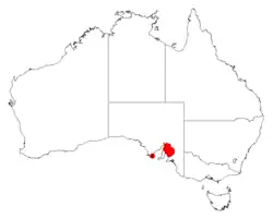 It is endemic only in a small area where it has a patchy and sparse distribution[1] in South Australia from northern parts of the Mount Lofty Range from around Burra to Auburn in the north to around the southern parts of the Tothill Ranges in the south where it is found as a part of open Eucalyptus woodland and mallee communities.[2] A population is also known at the southern tip of the Eyre Peninsula which is thought to be a naturalised population. The total area of occurrence is thought to be around 1,800 km2 (690 sq mi) It is found on grows on rocky hills, along creeklines and on roadsides growing in duplex soils with loamy soils above red clay that are usually alkaline and well-drained.[1]