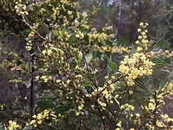 The erect slender and open shrub typically grows to a height of 1 to 3 metres (3 to 10 ft).[4] The prominently yellow-ribbed branchlets have pungent and hardened stipules with a length of 2 to 8 millimetres (0.079 to 0.315 in). The thin evergreen phyllodes have an obliquely lanceolate to ovate shape and are usually 5 to 11 centimetres (2.0 to 4.3 in) in length with a width of 1 to 4 cm (0.39 to 1.57 in). They are narrowed at base and have two to four prominent longitudinal nerves on the face.[1] It blooms from May to October and produces cream-yellow flowers.[4] The inflorescences occur as two to five headed racemes, usually with two on each node. The flower heads have a spherical shape and contain 8 to 12 loosely bunched pale yellow or white flowers. After flowering black sub-woody seed pods with a twisted narrowly linear shape that are around 14 cm (5.5 in) in length and 2 to 4 mm (0.079 to 0.157 in) wide. Each pod contains severalglossy dark brown seeds with an oblong to elliptic shape and a length of 3 to 4 mm (0.118 to 0.157 in).[1]