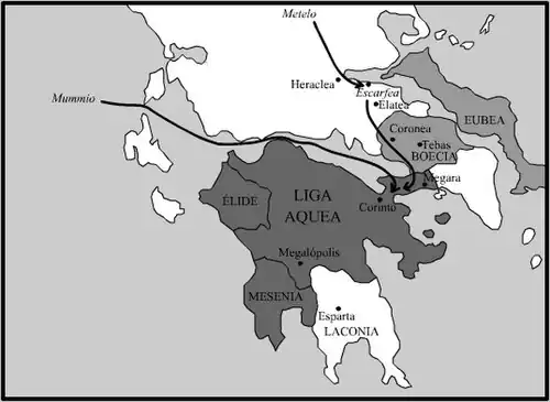 The defeat and death of Critolaos caused great confusion and panic in the Greek world, with some cities such as Elis and Messene now surrendering to the Romans.[16] However, many elements of the League, especially Corinth, rallied around Diaeus, electing him as strategos to replace Critolaos and resolving to continue the war, with harsh levies and confiscations of property and wealth.[17] Metellus now advanced through Boeotia, capturing Thebes, which had been allied to the Achaeans. He made an offer of peace to the League, but was rebuffed by Diaeus, who also had pro-peace and pro-Roman politicians arrested or killed.[18]
