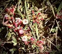 Acmispon cytisoides, synonyms Lotus benthamii and Syrmatium cytisoides, is a species of legume native to California.[2][3] It is known by the common names Bentham's broom and Bentham's deerweed.[4][5] It is endemic to central California, where it occurs along the Central Coast and into the coastal mountain ranges.[4][3] It grows in oceanside habitat and inland on slopes and in canyons. It is a mat-forming or spreading perennial herb lined with leaves each made up of a few oval leaflike leaflets up to 12 mm long.[3] The inflorescence bears up to 10 dull pinkish dark-veined flowers, each just under 1 cm long.