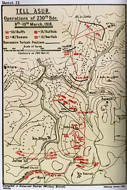 Meanwhile, infantry from the 53rd, 74th and 10th Divisions advanced north up both sides of the Jerusalem to Nablus road from Kefr Malik to Nebi Saleh cutting off all tracks and roads leading to the lower Jordan Valley.[1][3] The 53rd (Welsh) Division's objective; the capture of Tell 'Asur, was assigned to the 158th Brigade. The Tell was a very valuable observation post with views extending north to the hills of Galilee with Mount Hermon in the background 90 miles (140 km) away, in the east and south-east to Gilead, Moab and most of the Dead Sea, in the south over the Mount of Olives to the heights of Hebron and west to the Mediterranean from south of Jaffa to north of Caesarea. It was captured by the 5th Battalion, Royal Welch Fusiliers about 09:30 after a heavy bombardment by the 91st Heavy Battery but the position was far from secure being subjected to a successful counter-attack shortly after, but the 6th Battalion, Royal Welch Fusiliers, drove them off. Four unsuccessful attempts by Ottoman forces were made to regain this hill.[8]