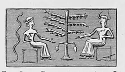 Assyriologist George Smith described the Adam and Eve seal as having two figures (male and female) on each side of a tree, holding out their hands to the fruit, while between the backs of the figures is a serpent, which he saw as evidence that the Fall of Man legend was known in early times of Babylonia.[1][3][4]