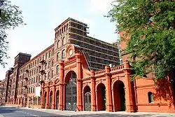 A large number of brick mill buildings in the Northeast United States have undergone mill conversion projects. In the United States, especially in the Northeast and Midwest, loft housing is one prominent result of adaptive reuse projects. Formerly-industrial areas such as the Meatpacking District in New York City, Callowhill in Philadelphia and SoMa in San Francisco are being transformed into residential neighborhoods through this process. This transformation is sometimes associated with gentrification. Station Square in Pittsburgh Pennsylvania is an example of a mile-long former Pittsburgh and Lake Erie Railroad terminal and headquarters being converted into a retail, office, hotel, and tourist destination. The Pratt Street Power Plant in Baltimore was converted to offices, retail, and restaurants. An example of adaptive reuse conversion to office/business space are the Hilliard Mills. The adaptive reuse of Empire Stores will transform seven abandoned coffee warehouse in Brooklyn Bridge Park in New York City into office, retail, restaurant and a rooftop public park.[33][34]