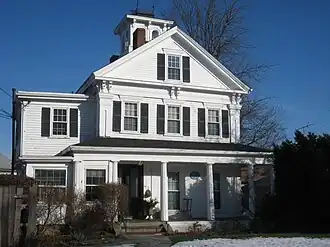 The 2+12-story wood-frame house was built in the first half of the 19th century for Addison Hill, whose family dominated the upland area of Arlington in that period. The house is an excellent local example of transitional Greek Revival-Italianate styling. Its basic massing is Greek Revival, as is its front porch, but its eaves have double brackets typical of Italianate styling, and the cupola is also a distinctive Italianate touch.[2]